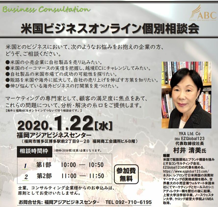 1月22日(水)に福岡アジアビジネスセンター主催による、米国向けマーケティング オンライン個別相談会が開催されます。弊社の代表を務める 村井清美が、海外市場での新製品成功、販路拡大、競合との差別化、伸び悩んでいる製品の打開策など、顧客の満足度に焦点をあて、マーケティングの手法を用いて、その解決のお手伝いとなるアドバイスを致します。