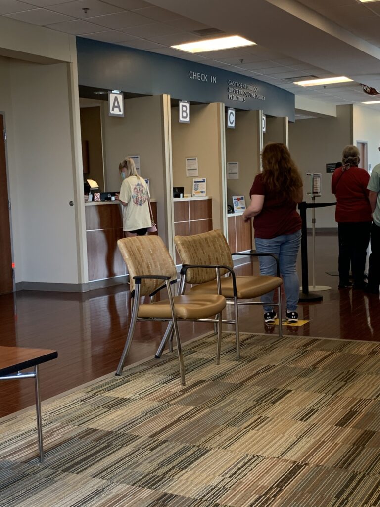 (写真12)病院では再開後も、アポイントを取るときに健康状態について質問されます。新型コロナウィルスの保菌者かどうか、保菌者に接触したか、体調が悪いかどうかなどです。また、病院ではマスクの着用を徹底しています。入口で、職員が中に入る前にアポイントメントのときと同じ質問を繰り返し、問題なければ入ることが出来ます。
