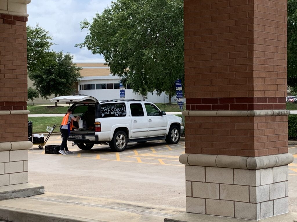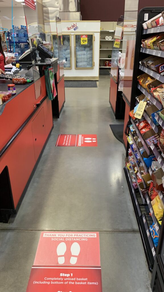 (写真1)HEBというテキサスの地方スーパーマーケットです。全米で消費者からの好感度が一番と高い評価をうけています。自宅待機発令中より、ソーシャルディスタンスを保つことを徹底するため、レジの待つ場所にマーカーがはられ、キャッシャーとお客の間に透明のボードが設けられています。レシートのやりとりは小さい穴を通してです。また、店員は全員マスクをしています。経済再開が始まった今も、自宅待機令中と同様です。