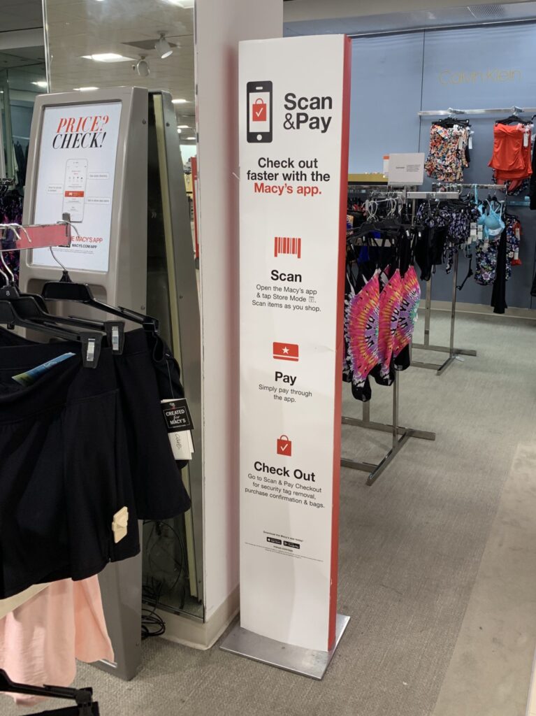 (写真3)Macy’sではCOVID-19対策として、顧客に支払いの決済を携帯のアプリケーションソフトウェアを使うことをサインで呼びかけています。