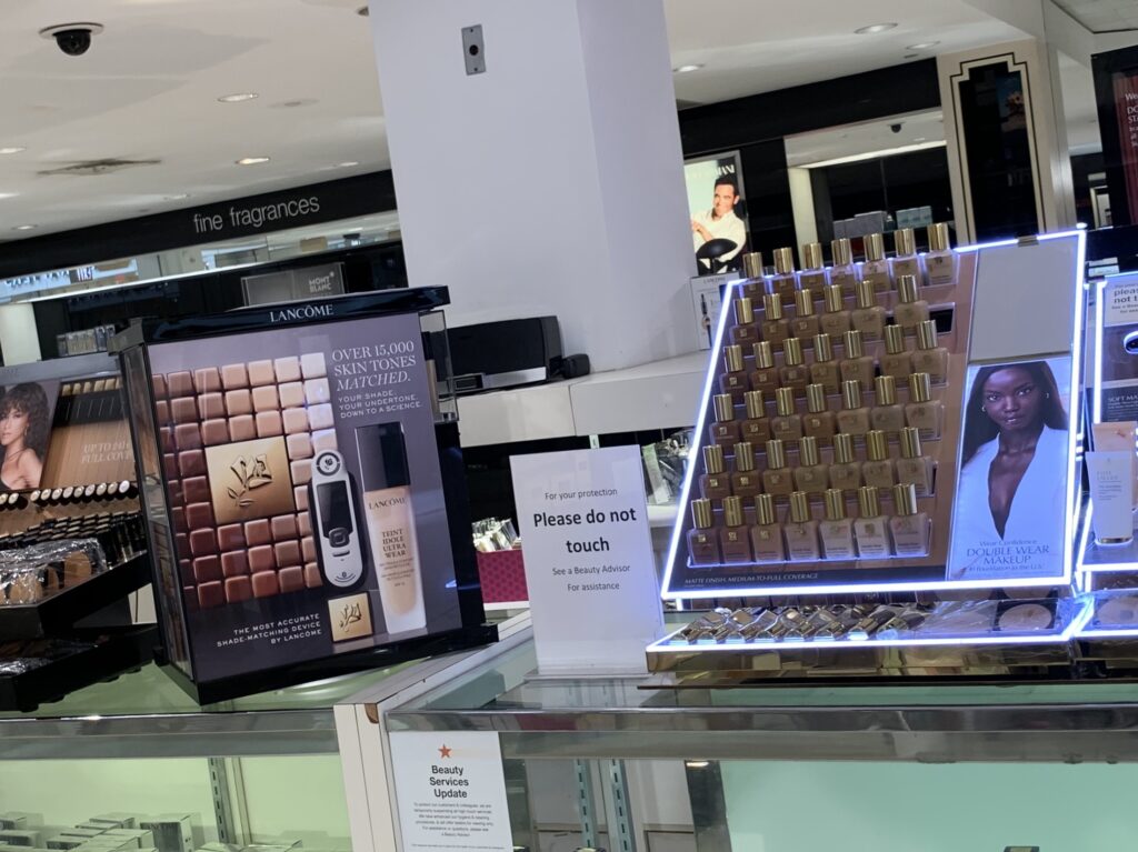 (写真4)化粧品など、試用サンプルを撤去したり、あっても店頭の商品に触らないようにサインがあります。必要な場合は、店員に声をかけるようにとなっています。