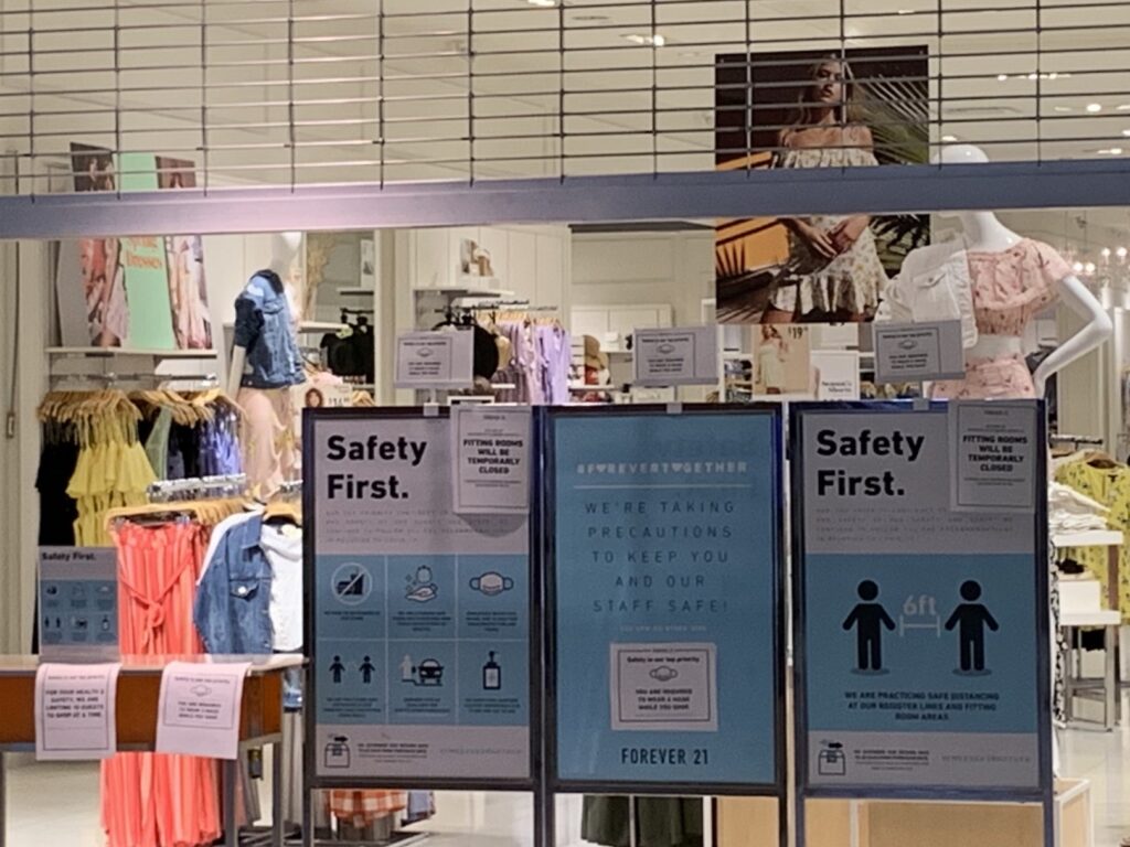 (写真5)モールの中のアパレルの店は再開されています。入口に顧客の安全対策に注意を払っている旨、および、顧客も自分たちの安全のためにソーシャルディスタンスのルールを守るように呼び掛けています。シャッターが半分閉じられ、入りにくい雰囲気があります。