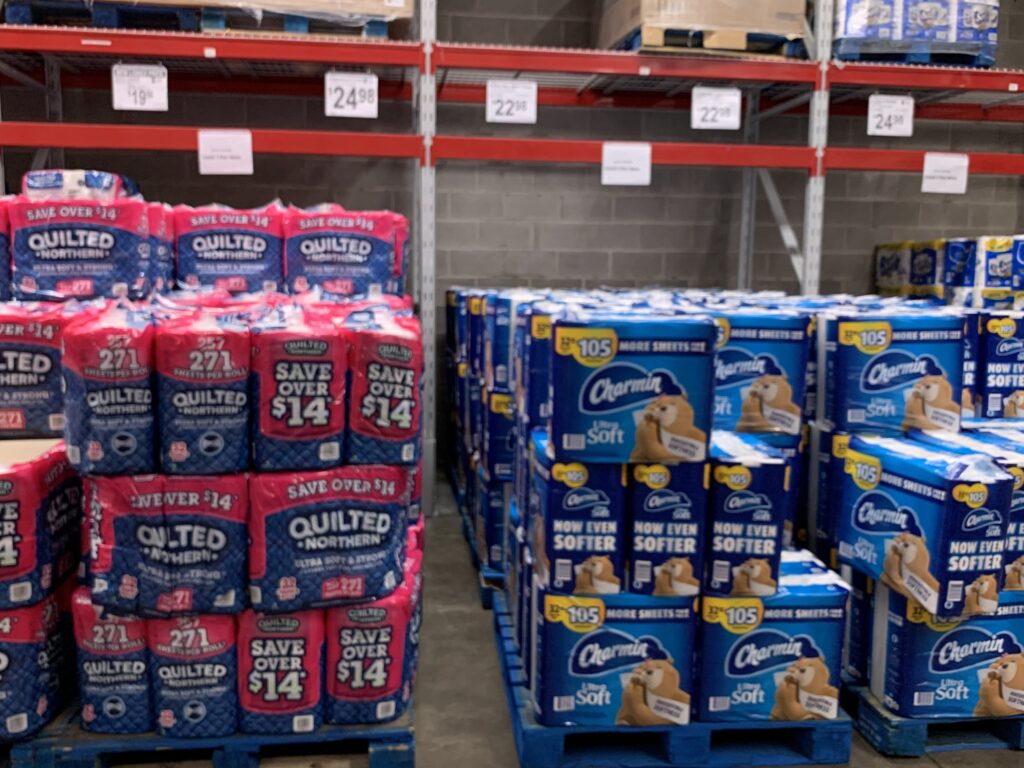 (写真14)一時期、品薄で、購入できなかったトイレットペーパーなどの紙製品が店頭に普通に並ぶようになりました。ですが、一人でひとつしか購入できません。他にも購入制限しているものは、赤ちゃんの紙おむつ、ワイプ、ミルク類、手を洗うソープ、肉類などがあります。